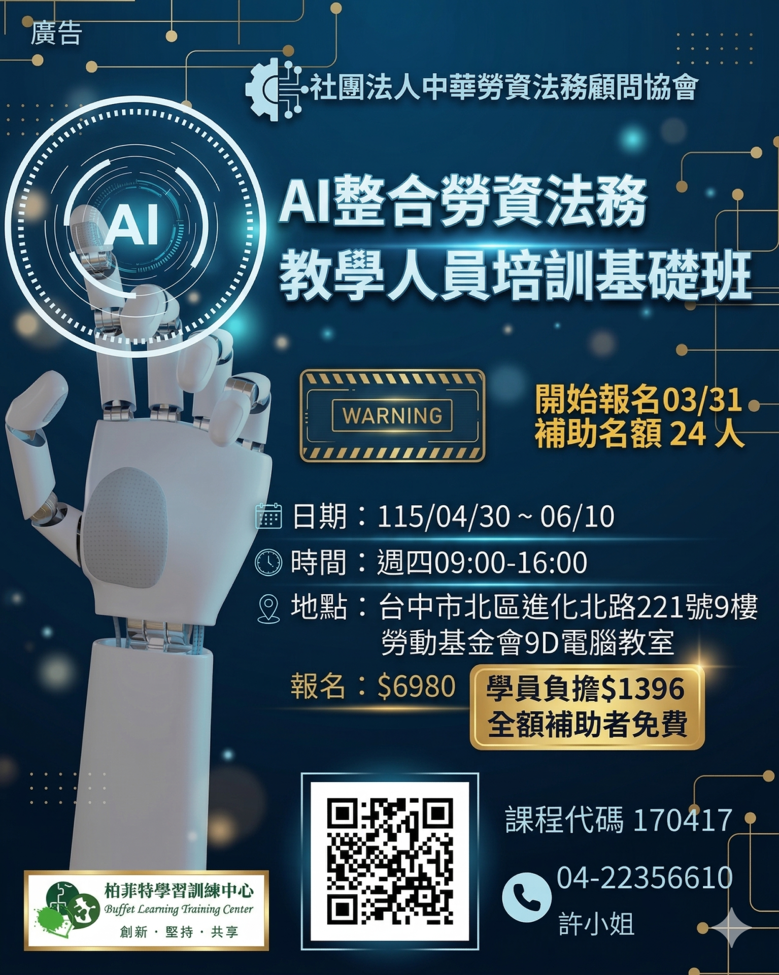 台中平日 115上 AI整合勞資法務教學人員培訓基礎班第01期 (政府補助班)